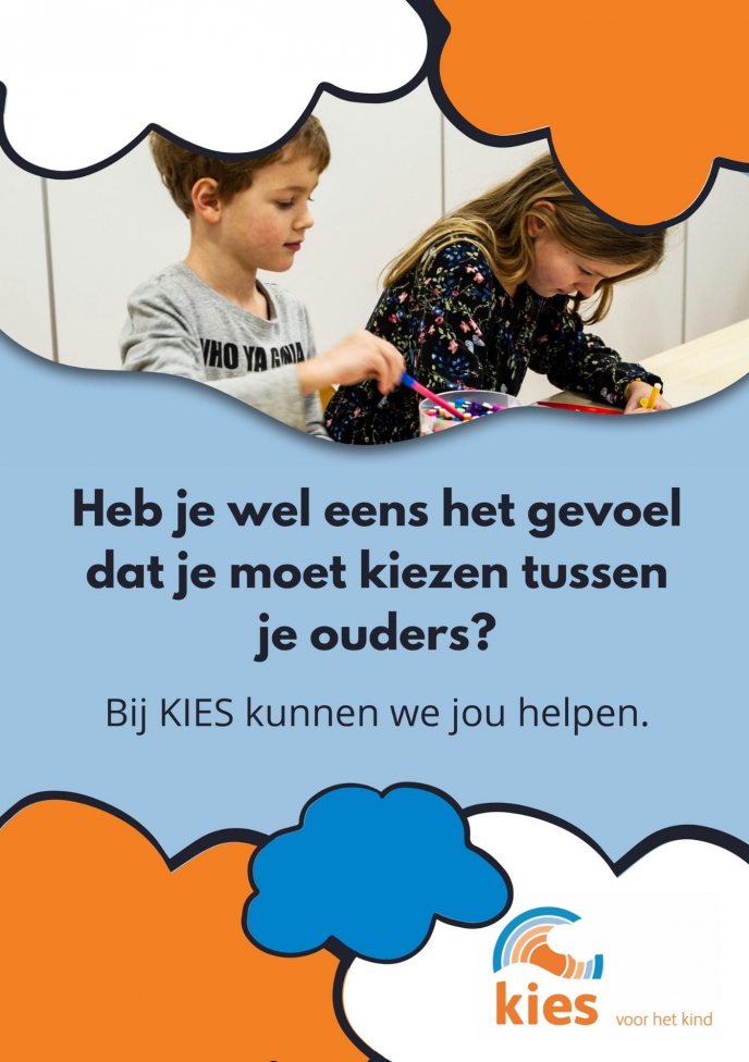KIES is er voor kinderen uit groep 5 t/m 8 met gescheiden ouders. In 8 bijeenkomsten praten we, doen we spellen, tekenen we en werk je in je eigen KIES-map. Het is leerzaam, luchtig en vooral fijn om te merken dat je niet alleen bent.
