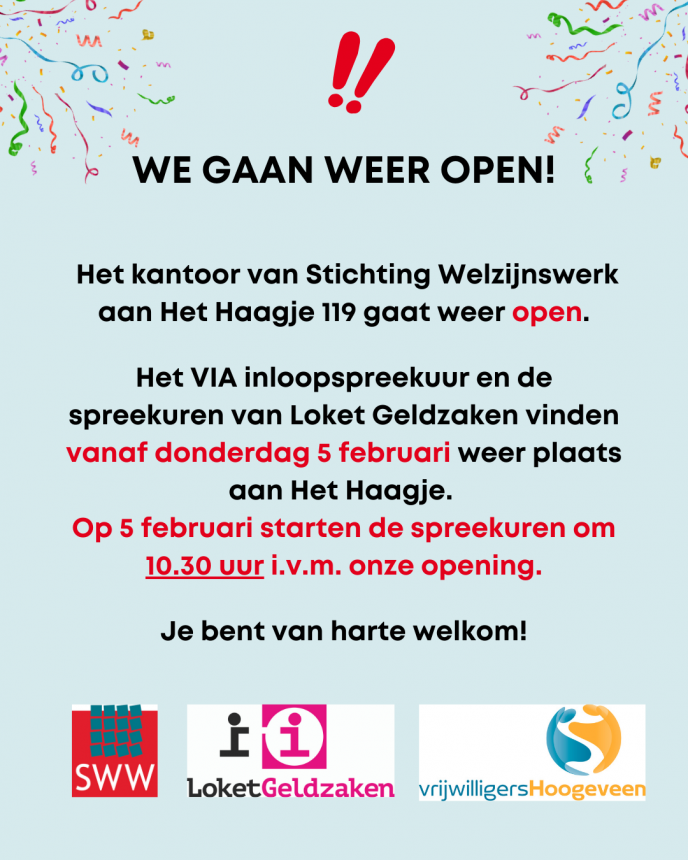 Vanaf 5 februari, eenmalig om 10.30 uur, vinden het dagelijkse VIA-inloopspreekuur en de spreekuren van Loket Geldzaken weer plaats aan Het Haagje 119. Binnenlopen kan zonder afspraak op alle werkdagen tussen 9.00 en 12.00 uur. Inwoners zijn van harte welkom.