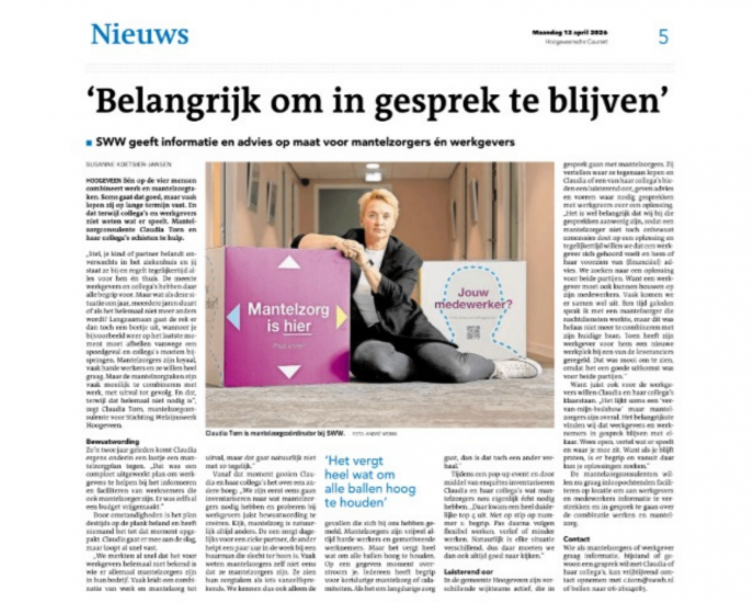 Goed om dit gesprek te blijven voeren: op de werkvloer, thuis en in de samenleving. Lees het interview dat mantelzorgconsulent Claudia Torn had met de Hoogeveensche Courant. Ben je werkende mantelzorger of werkgever, neem contact op als je hierbij ondersteuning zoekt.